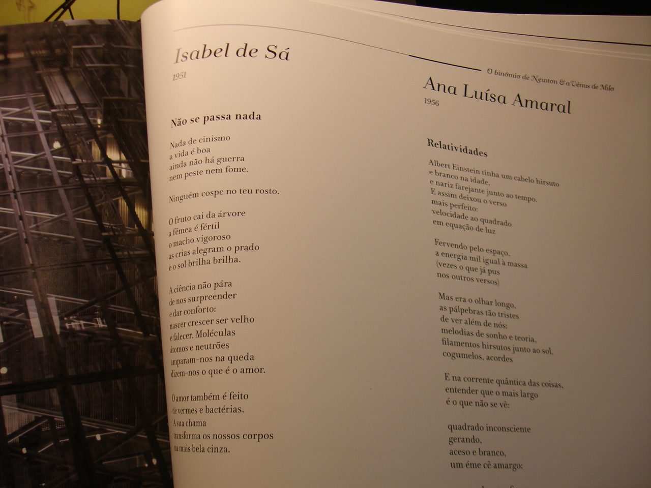 Uma bela edição de LUXO da Fundação Champalimaud e organizada por Maria Bochicchio e Vasco Graça Moura - O binómio de Newton & a Vénus de Milo - Edição de Poesia e Ciência na Literatura Portuguesa. Edição Aletheia, 2011. Poemas de Luís Miguel Nava, Isabel de Sá, Ana Luisa Amaral, Rosa Alice Branco, João Borges, Eduarda Chiote, Valter Hugo Mãe, Helga Moreira, Fernando Guimarães e muitos outros.